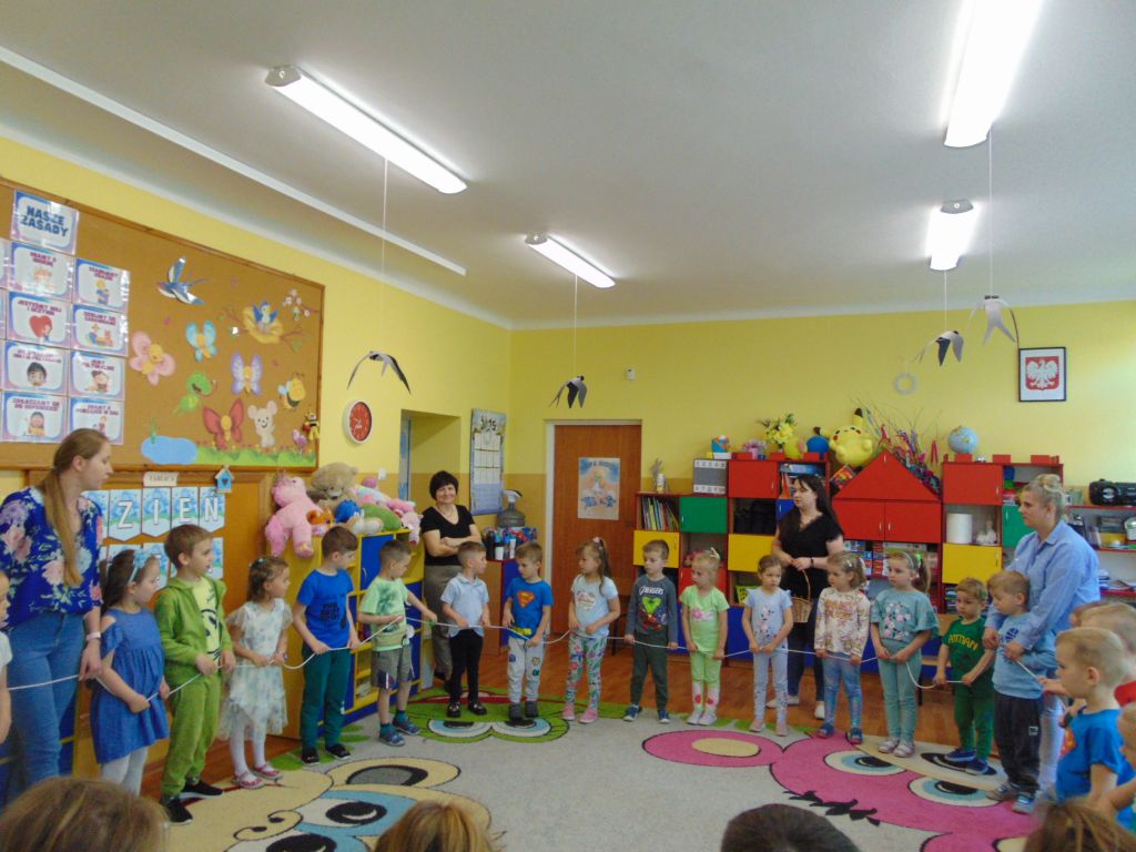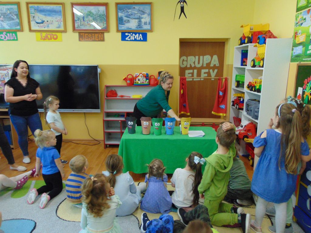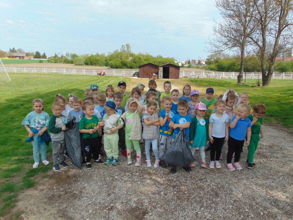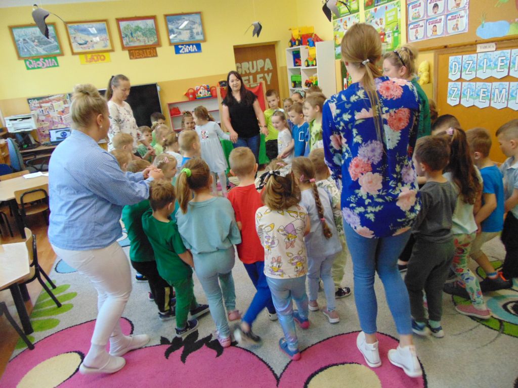 24 kwietnia w naszym przedszkolu obchodziliśmy Światowy Dzień Ziemi. Tego dnia dzieci miały na sobie ubrania w kolorze niebieskim i zielonym. Obchody rozpoczęliśmy pogadanką o tym co możemy dobrego zrobić w przedszkolu i w naszych domach dla naszej planety. Potem obejrzeliśmy film o Ziemi, zaśpiewaliśmy piosenkę „Ziemia jest okrągła”, posegregowaliśmy śmieci. Dzieci obejrzały teatrzyk przygotowany przez swoje panie, a następnie zaopatrzeni w rękawice i worki udaliśmy się na plac przedszkolny aby go posprzątać. Na zakończenie dnia każdy przedszkolak otrzymał odznakę przyjaciela Ziemi oraz słodki upominek od pani dyrektor, która gościła na naszych zajęciach.