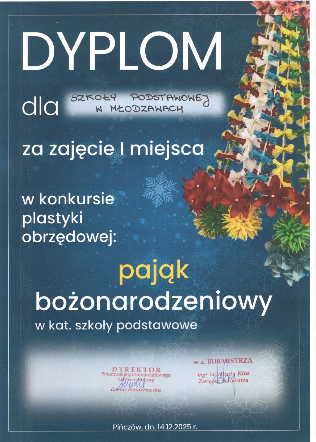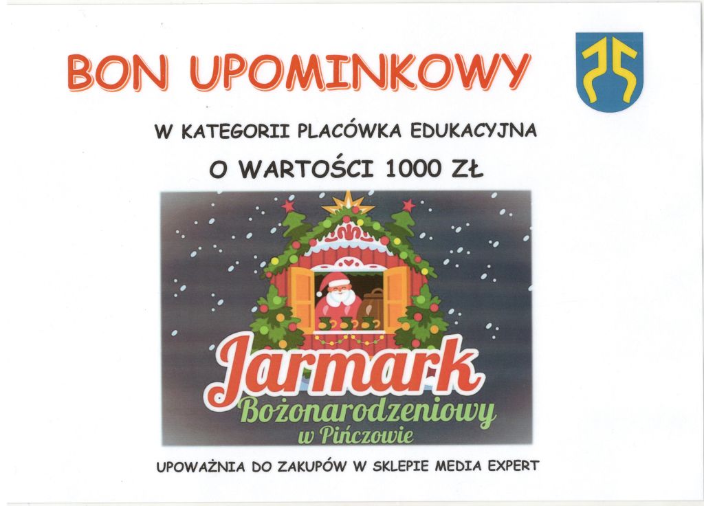 W niedzielę, podczas Jarmarku Bożonarodzeniowego, odbyło się rozstrzygnięcie konkursu. Miło nam poinformować, że nasz pająk zajął I miejsce w kategorii: placówka edukacyjna. W nagrodę otrzymaliśmy piękny dyplom i bon upominkowy w kwocie 1000 zł, upoważniający do zakupów w sklepie Media Expert. Fundatorem nagrody jest Burmistrz Miasta i Gminy Pińczów.