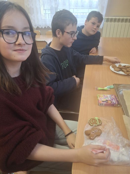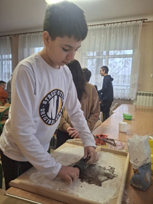 Uczniowie, pod czujnym okiem nauczyciela, zapoznali się z zasadami bezpieczeństwa i higieny pracy, a następnie samodzielnie przygotowywali ciasto, formowali pierniczki oraz dekorowali je według własnych pomysłów. Zajęcia rozwijały kreatywność, samodzielność oraz umiejętność współpracy w grupie.