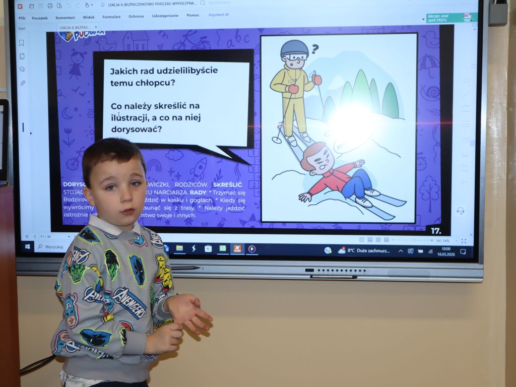 Po obejrzeniu filmu edukacyjnego rozmawialiśmy o tym, jak należy zachować się podczas wypoczynku latem nad wodą, w górach i w lesie oraz zimą podczas uprawiania różnych aktywności. Przypomnieliśmy sobie, czego robić nie wolno i o czym nie należy zapominać. Udzielaliśmy rad osobom popełniającym groźne błędy. Uzasadnialiśmy swoje wybory.